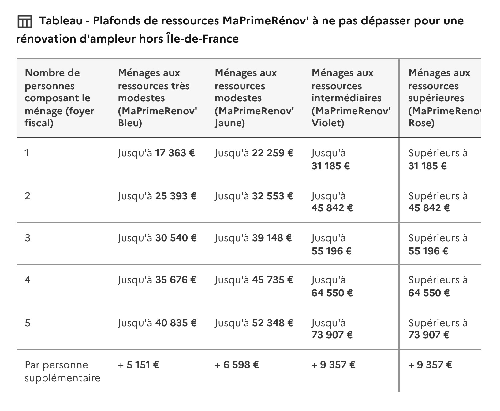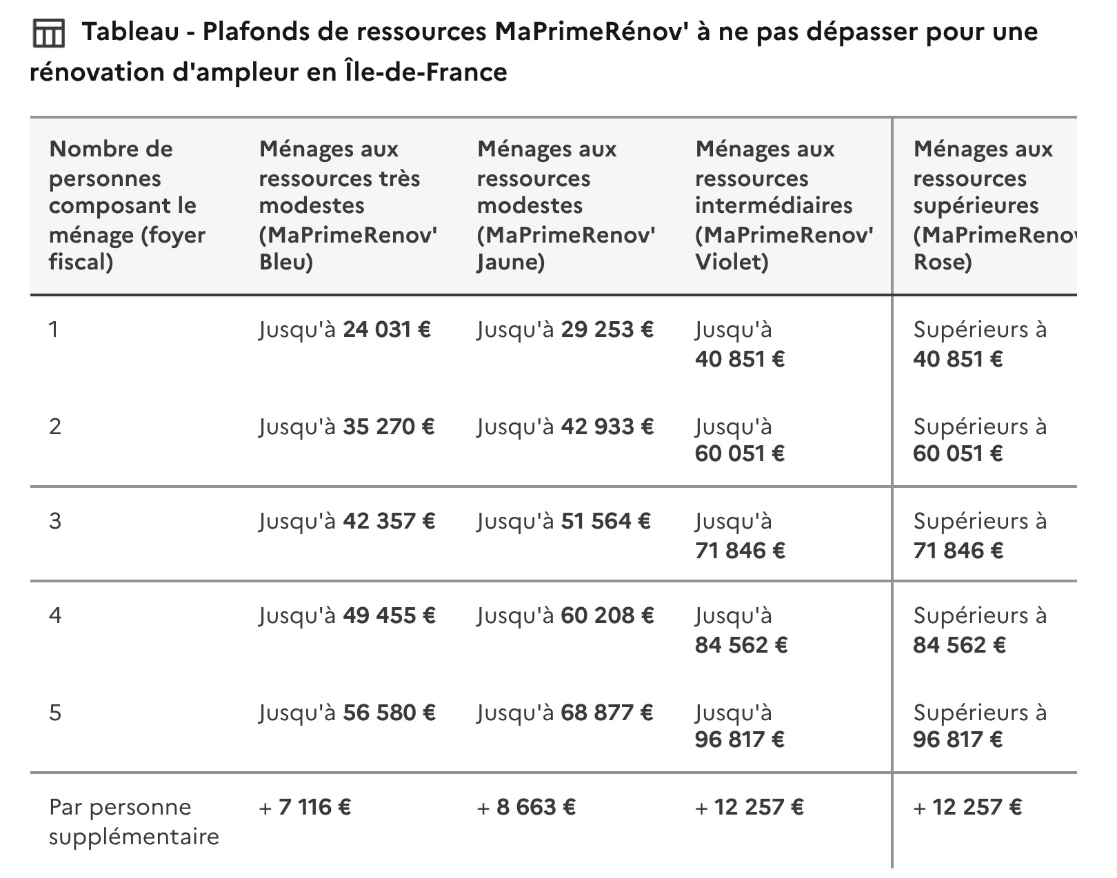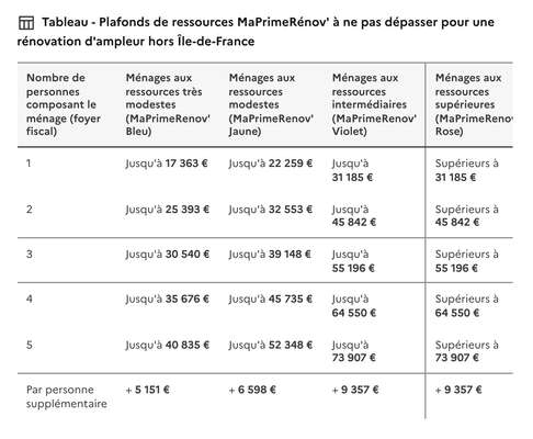 Ce tableau tient compte du nombre de personnes composant le foyer fiscal et de quatre niveaux de ressources affectés à des couleurs : très modeste (bleu), modeste (jaune), intermédiaire (violet), ressources supérieures (rose)